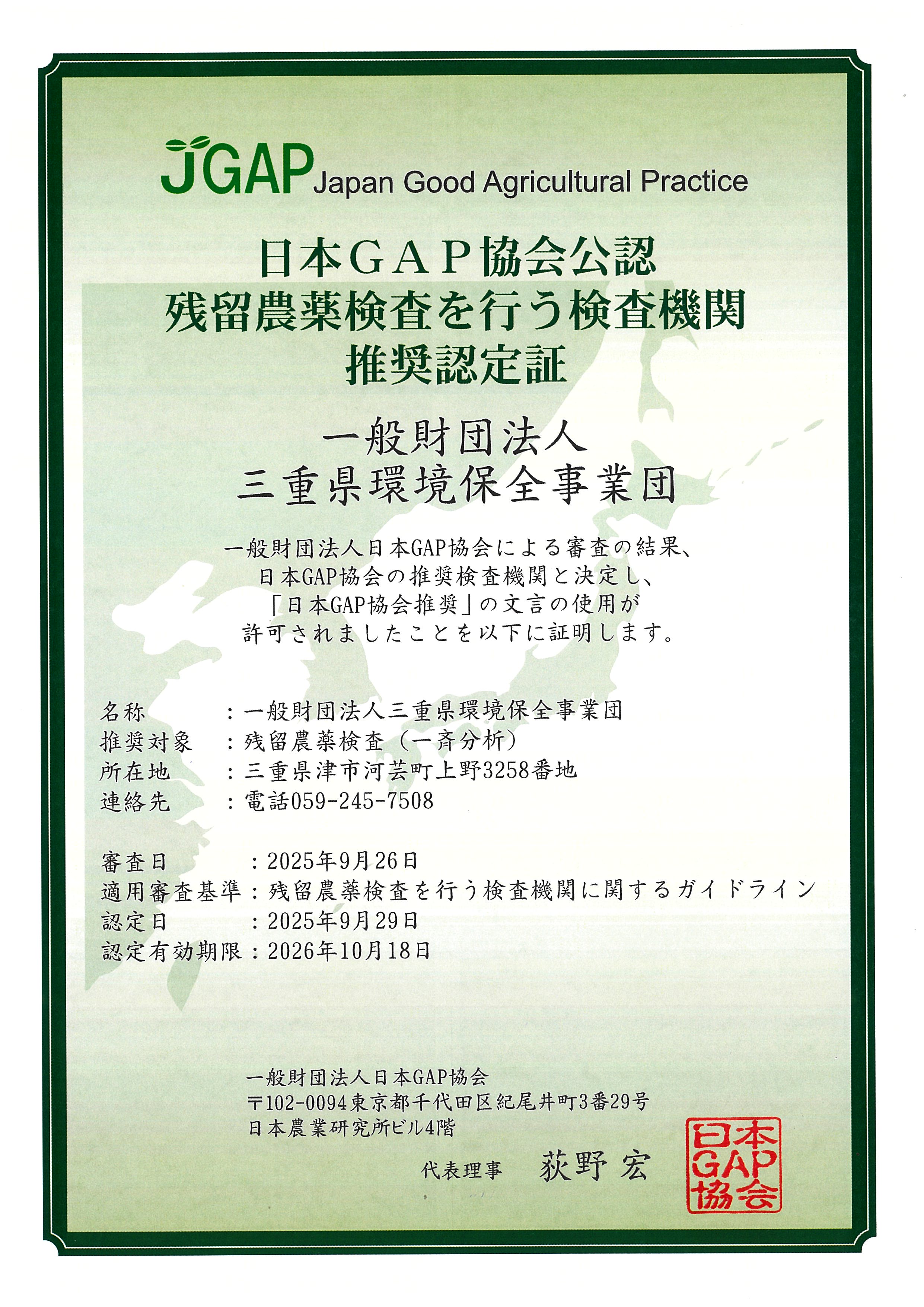 当事業団は、平成30年10月19日付で一般財団法人日本GAP協会の推奨検査機関の認定を受けました。これにより、当事業団の残留農薬検査が高い水準にあることが第三者機関から評価されました。
