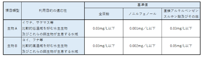 | 生物B | コイ、フナ等 比較的高温域を好む水生生物 及びこれらの餌生物が生息する水域 |