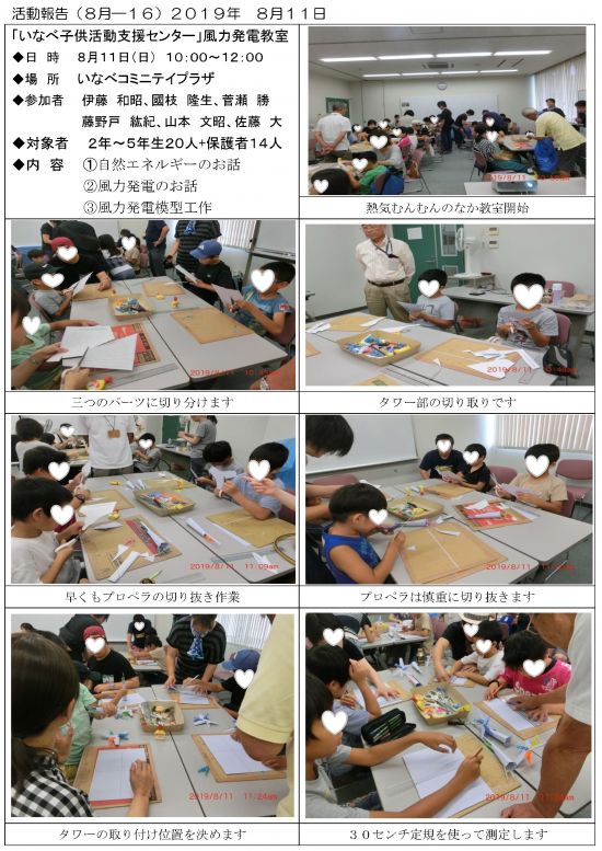 2019年8月11日(日)に、いなべコミュニティプラザで「風力発電教室」出前講座を行いました。 参加者は小学2年生~5年生20名と保護者14名でした。内容は・・・①自然エネルギーの話 ②風力発電のお話 ③風力発電模型工作
